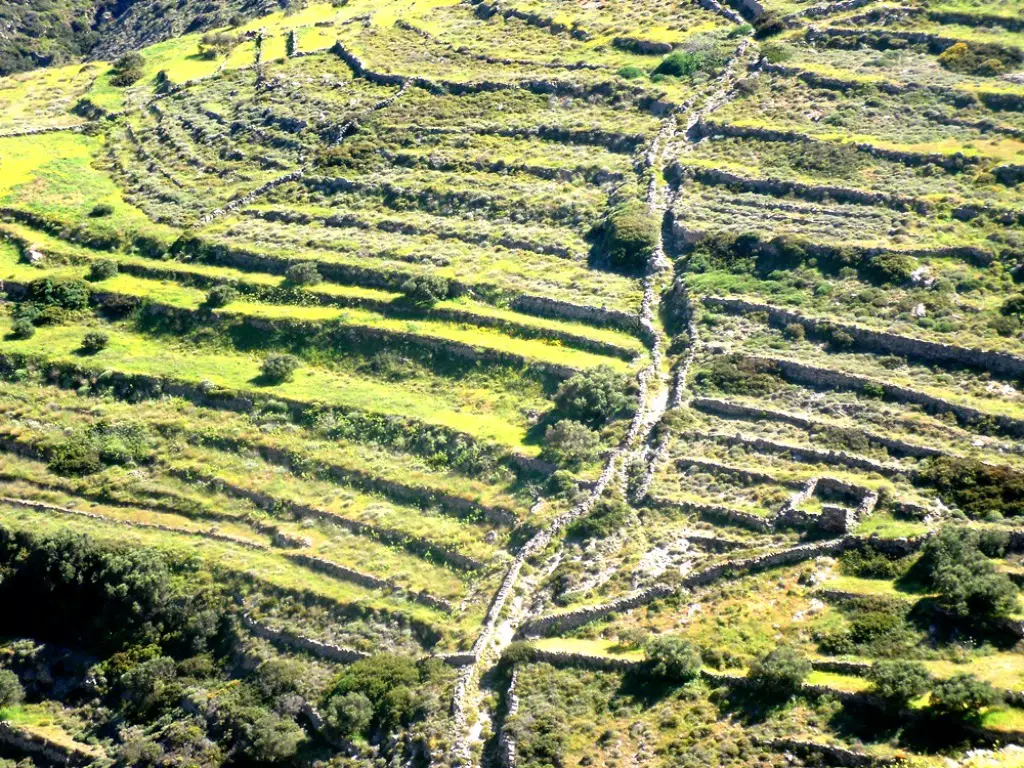 Gefielen mir die Ortschaften Alopronia, Chora und Pano Chorio schon sehr, so hat mich umso mehr die einzigartig schöne und gebirgige Landschaft mit ihrer beeindruckenden Terrassenkultur und Trockensteinmauern begeistert. Die intensive Terrassenbewirtschaftung hat mich sehr an Kimolos erinnert. Besonders der Westteil der Insel ist komplett mit bewirtschafteten Terrassen überzogen. Durch die Landschaft und den Trockensteinmauern führen Wege, sogenannte Monopathi und Kalderimi, entlang.