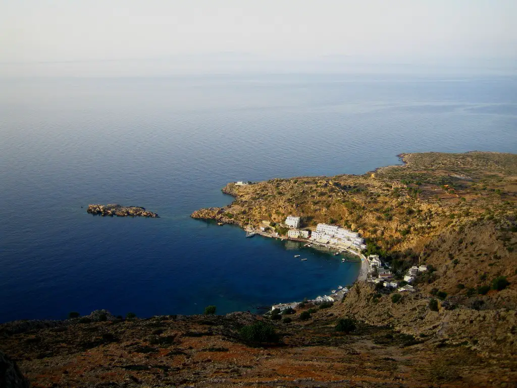 Nur eine kurze Trink- und Verschnaufpause gönnen wir uns, denn wir wollen die kühle, sonnenlose Zeit für den Aufstieg nutzen. Inzwischen sind die Häuser unten im Dorf, schon von der Sonne angestrahlt, nur noch als weiße Schachteln zu erkennen. Auf dem Meer winzig klein die Fähre, die die ersten Wanderer zur nahen Samariaschlucht bringt, im Wasser eine Spur wie von einer Schnecke hinter sich herziehend.