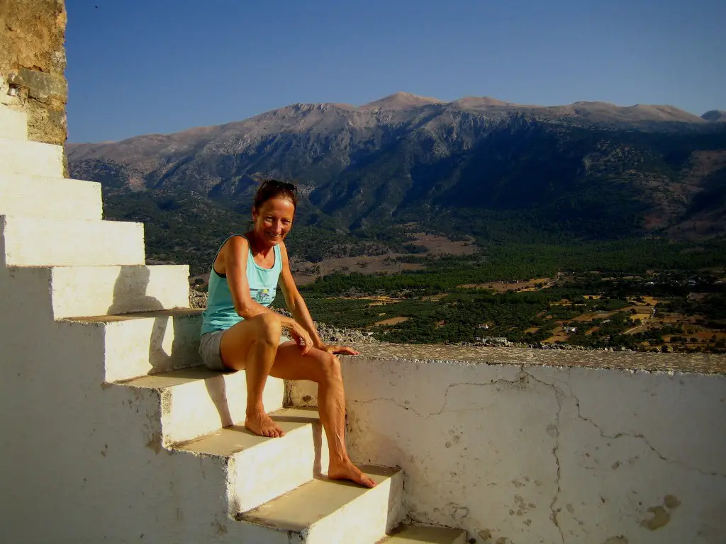 Der 360° Rundumblick ist die Belohnung für unseren Frühsport: Das Meer, das sich sommerblau und unendlich weit ausdehnt, in der Ferne schemenhaft die langgestreckte Insel Gavdos. Hinter uns das helle Massiv der Levka Ori, der “Weißen Berge“ Kretas mit ihrem markanten höchsten Kegel, dem 2453 m hohen “Pachnes“, im Morgenlicht strahlend. Aus der grünen Hochebene davor begrüßen Hunde, Hähne und die munteren Glöckchen der Schafe den neuen Tag. Irgendwo schreit ein Esel….und über allem der wolkenlose Himmel, sich mit Meer und Bergen verbindend und uns das Gefühl gebend: Wir stehen auf der Weltkugel.