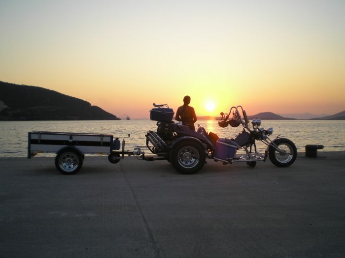 Mit der Fähre fuhren wir dann auf den Peloponnes. Auf dem Camping in Kyparissia war es wie im Schlaraffenland. Von Maulbeerfrüchten, über Zitronen, Melonen, Aprikosen, Limetten, ich weiß nicht, was noch alles, konnte man alles ernten. Und auch hier lernten wir wieder die Hilfsbereitschaft der Griechen kennen, da wir dringend einen Zahnarzt brauchten. Total beeindruckend war dann die Fahrt von Kalamata nach Githio, über Sparta. Wieder ging es durch einsame Bergdörfer und ich saß immer auf dem Trike und dachte nur: “Ja, das ist das Land der Götter“.