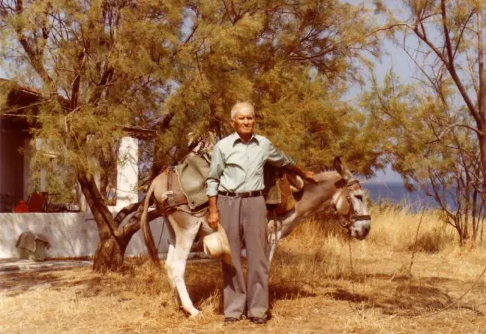 Diese Freundschaften, der nahe Strand „Krio Neri“, die ruhige Lage des Häuschens bewogen uns später immer wieder auch mit den Kindern hierher zu kommen. Da ich hier vor allem Ruhe und Erholung vom Berufsalltag suchte und fand, verpasste ich es leider neugriechisch zu lernen. Mit den Nachbarn - Bauern - konnten wir nur mühsam diskutieren. Trotzdem erfuhren wir ihre Gastfreundschaft aufs herzlichste. Obwohl wir ein Auto hatten, sie selber nicht, waren wir für sie die Armen. Sie maßen den Reichtum an der Anzahl eigener Olivenbäume und wir hatten keine. So fanden wir am morgen oft frische Gurken oder Tomaten aber auch frische Eier vor der Haustür. Wir wurden auch in ihre Häuser zum Essen eingeladen. Diese hatten nur gestampfte Erde als Boden. Neben dem Herd war das Schwein am Bein angebunden als Abfallverwerter. Es gab im Haushalt nur je zwei Gläser, Messer, Gabeln etc. Je eines für ihre Familie und je eines für uns Gäste. Krank wurden wir deshalb nie.