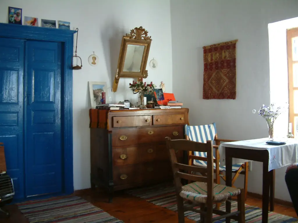 Es hatte bei mir Eindruck hinterlassen. 2 Jahre danach fuhr ich wieder hin. Noch war die Anreise schwierig. 1972 fuhren wir per Fähre bis Ios, um dann mit einem Fischerboot – halbwegs illegal – nach Milos zu gelangen. Und in jenem Jahr war mein Freund so begeistert, dass wir planten, – so jung und studentisch, wie wir waren - ein Haus zu kaufen. Die verrottenden Mühlen waren etwas zu eng. 1973 fuhren wir mit ein paar tausend D-Mark nach Milos. Ein Tischler im Nachbardorf und ein alter Grieche, der 7 Sprachen halfen uns dabei. Sie zeigten uns leerstehende, auch ruinöse Häuser. 3 Kriterien waren uns wichtig: 1 Zisterne, 1 Toilette im Haus, 1 Ausblick aufs Meer. Nach 2 Wochen Suche hatten wir endlich unser doppelstöckiges Spiti, mitten im Dorf. Schäden – keine. Bis auf einen Riss in der Küchenecke – der Verkäufer sagte, das ist ein Erdbebenschaden von 1927. Ohne zu viel Bürokratie konnten wir das Haus in 3 Tagen erwerben. Wir konnten fast sofort einziehen; auch ein paar Möbel blieben uns erhalten: 1 Bett, 3 Truhen, 1 Kommode, ein paar Stühle, ein Sofa – alles aus alter Zeit.