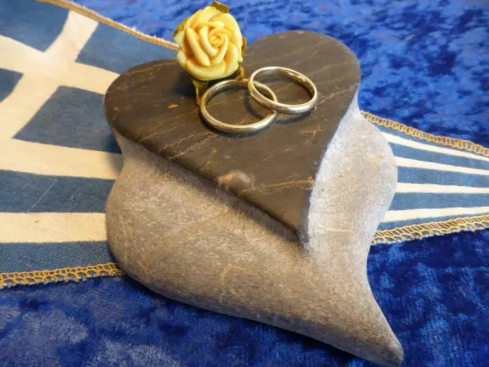 Das sollte beim Kykladen-Inselhüpfen auf Amorgos geschehen. Dort fanden wir aber gar kein entsprechendes Geschäft. Der Zufall brachte uns im weiteren Verlauf der Reise in ein Schmuckgeschäft mit äußerst netten Besitzern in Naxos. Dort wurden wir so toll beraten, dass wir uns sofort ein Paar goldene Ringe bestellten. Um sie später abzuholen, änderten wir sogar unseren eigentlich geplanten Reiseverlauf. Das für die Ringe gedachte, außergewöhnliche „Ringkissen“ entdeckten wir dann beim weiteren Inselhüpfen in dem Geschäft von einem Steinmetz auf Koufonissi. 3 Monate später heirateten wir in Begleitung von 3 befreundeten Paaren in Deutschland. Die griechischen Ringe lagen auf dem steinernen „Kissen“ in Form eines doppelten Herzens und wir steckten sie uns gegenseitig an. Mit ihrer Geschichte und Herkunft sind sie, wie überhaupt ganz Griechenland mitseinen Menschen, etwas sehr Besonderes für uns!