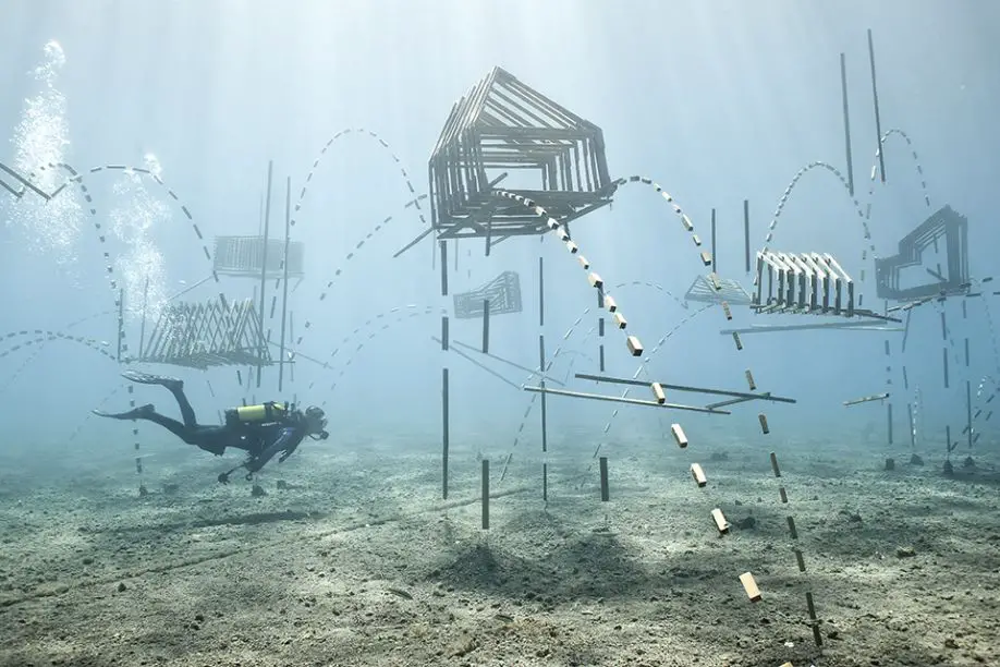 Das Projekt trägt den Titel „Autonomy“ und besteht aus mehreren Skulpturen, die sich durch das Wasser und seine Bewegungen bis zu einem gewissen Grad eigenständig bewegen. Die aus Holz geschaffenen Ausstellungsstücke stellen ein versunkenes Dorf da, welches sich langsam in seine Einzelteile auflöst. Es sieht fast so aus, als schwebten die Teile selbstständig durch das Wasser und setzten sich immer wieder neu zusammen. Die Ausstellung zeigt nicht nur ein magisch anmutendes Unterwasserdorf, sondern sie will gleichzeitig auch auf den Klimawandel aufmerksam machen. Der Meeresspiegel steigt und auch Regen findet einen neuen Rhythmus. Das Projekt bildet ein Gedankenspiel der beiden Künstler ab: Wie sähe ein flexibleres Lebensumfeld aus? Ein Lebensraum, der sich ausdehnt, zurück in seine ursprüngliche Form kehrt und sich neu orientiert, als würde die Erdanziehungskraft keine Rolle spielen. Das Dorf im Meer vor Hydra hat einige dieser Eigenschaften: Die hölzernen Konstruktionen passen sich an ihre Umwelt an, dehnen sich aus und schrumpfen zusammen, ganz so wie die Meeresbewegungen es ihnen vormachen. Ob mit Schnorchel oder in voller Tauchmontur, einen Blick unter die Wasseroberfläche zu werfen lohnt sich.
