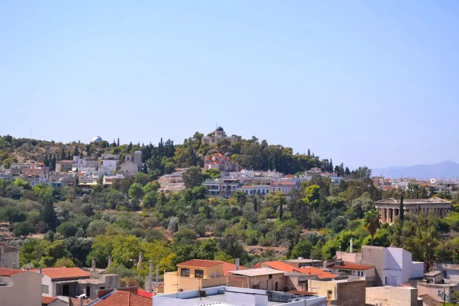 Unser Foto (© Griechenland Zeitung / Jan Hübel) zeigt den Blick von einer Dachterasse in Monastiraki auf die Sternwarte.