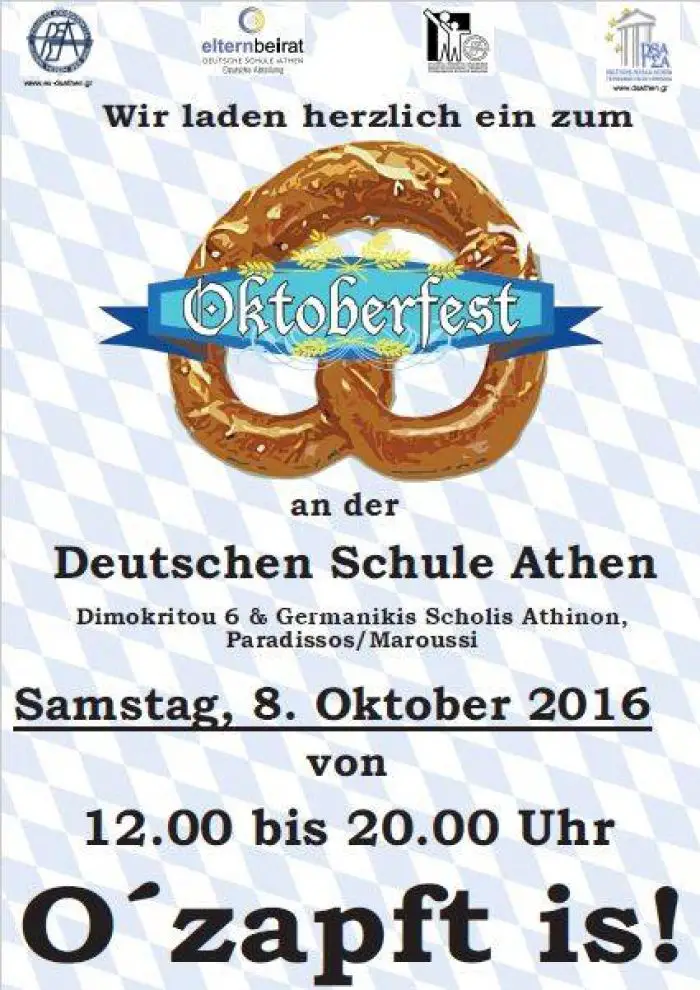 O´ zapft is! Heißt es morgen bei dem Oktoberfest der Deutschen Schule in Athen. Ab 12:00 Uhr kann man sich dort den Tag mit Speis und Trunk vertreiben.