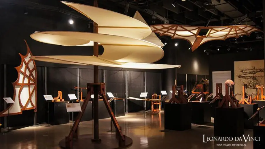 Mehr als 200 Ausstellungsstücke, welche in Zusammenarbeit mit dem Leonardo da Vinci Museum in Rom entworfen wurden, können in der Schau bestaunt werden, darunter etwa 75 Modelle von Erfindungen, die man in Form von authentischen Reproduktionen in Originalgröße sowie von interaktiven Maschinen nacherleben kann.