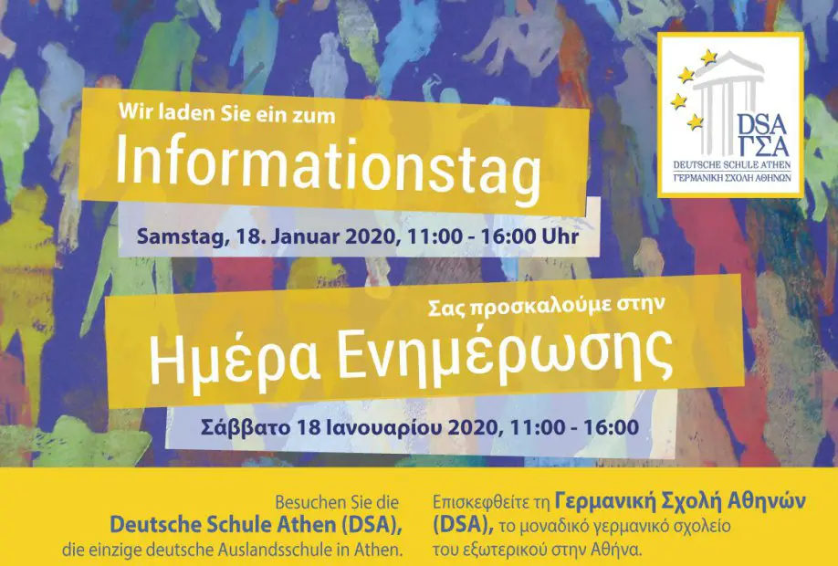 Die Deutsche Schule Athen (DSA) lädt alle Interessenten am Samstag (18. Januar) zum diesjährigen Informationstag ein. Die Besucher haben dabei die Gelegenheit, die einzige deutsche Auslandsschule in Athen kennenzulernen.