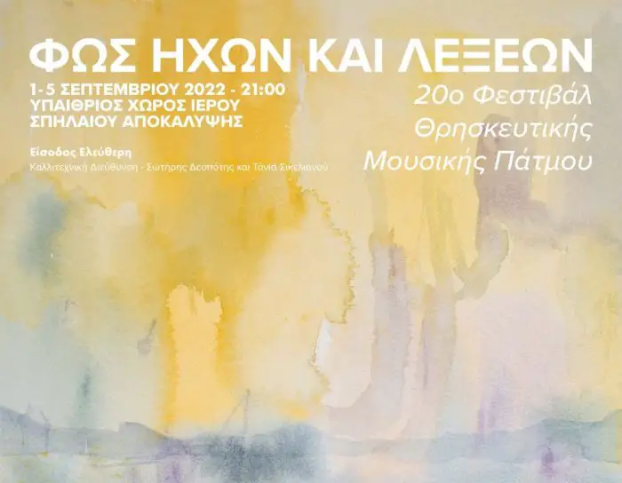Die künstlerische Leitung liegt in den Händen von Sotiris Despotis und Tania Sikelianou. Thema des diesjährigen Festivals ist „Licht, Töne und Worte". Und die Atmosphäre dieser Insel eignet sich wie keine andere, um die Zuhörerinnen und Zuhörer über musikalische Darbietungen auf „mystische Pfade und melodische Klangpfade“ zu entführen. Ort der Aufführungen unter freiem Himmel ist das Areal bei den sogenannnten Heiligen Höhlen der Apokalypse, in denen der Apostel Johannes zu seiner Offrenbarung („Apokalypse“), abschließender Teil des Neuen Testaments, inspiriert worden sein soll. Zu den Mitwirkenden in diesem Jahr zählen u. a. die Band der griechischen Marine, die Psalmesänger von Ilissia, Phaedra Yannelou mit dem Chor von Chios, Alexandre Brusilovksy und Aleksandra Dzenisenia. Eines der Highlight ist ein Klavierkonzert von Konstantinos Destounis (4.9.). Organisiert wird das Festival vom Kulturzentrum der Gemeinde Patmos sowie dem Generalsekretariat für Ägäis- und Inselpolitik. Es steht unter der Schirmherrschaft der Griechischen Zentrale für Fremdenverkehr (GZF bzw. EOT). Mehr Infos hier: sacredmusicfestivalofpatmos.gr (griechisch)
