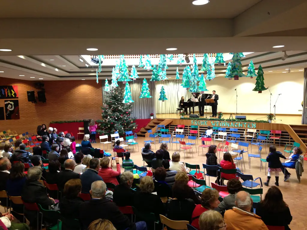 In der wunderschön geschmückten Aula der deutschen Schule spielten am Sonntag, 30. November, viele Musiker weihnachtliche Melodien anlässlich des Weihnachtsbasars in Thessaloniki.