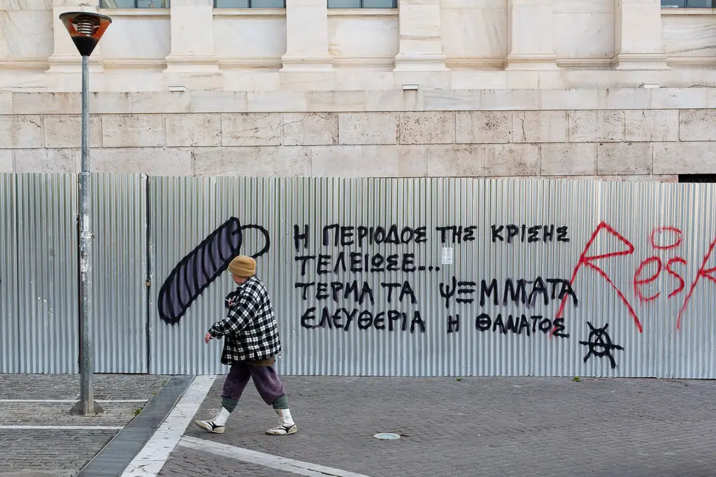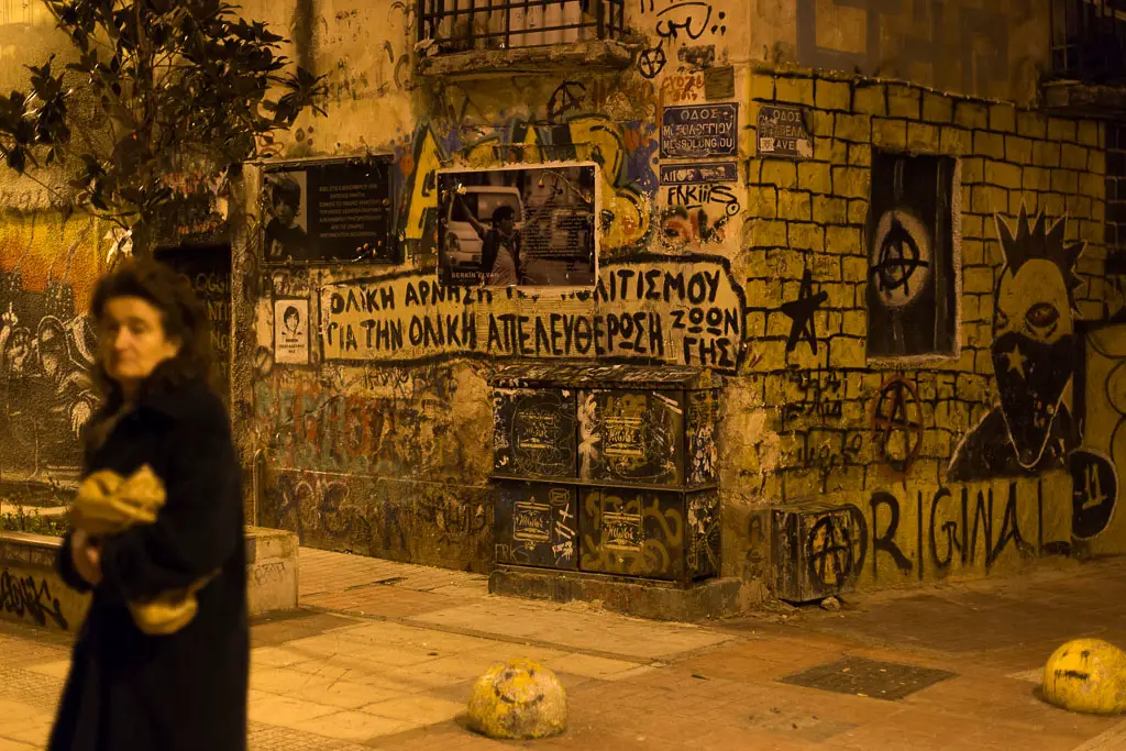 Einige Slogans, die wir in der Innenstadt gefunden haben, lauten: „Loukanikos R.I.P“, „Totale Verweigerung der Zivilisation für die totale Befreiung der Tiere und der Erde“ und „Krieg gegen die Angst“ sowie „Die Zeit der Krise ist vorbei ... Schluss mit den Lügen, Freiheit oder Tod“ ...