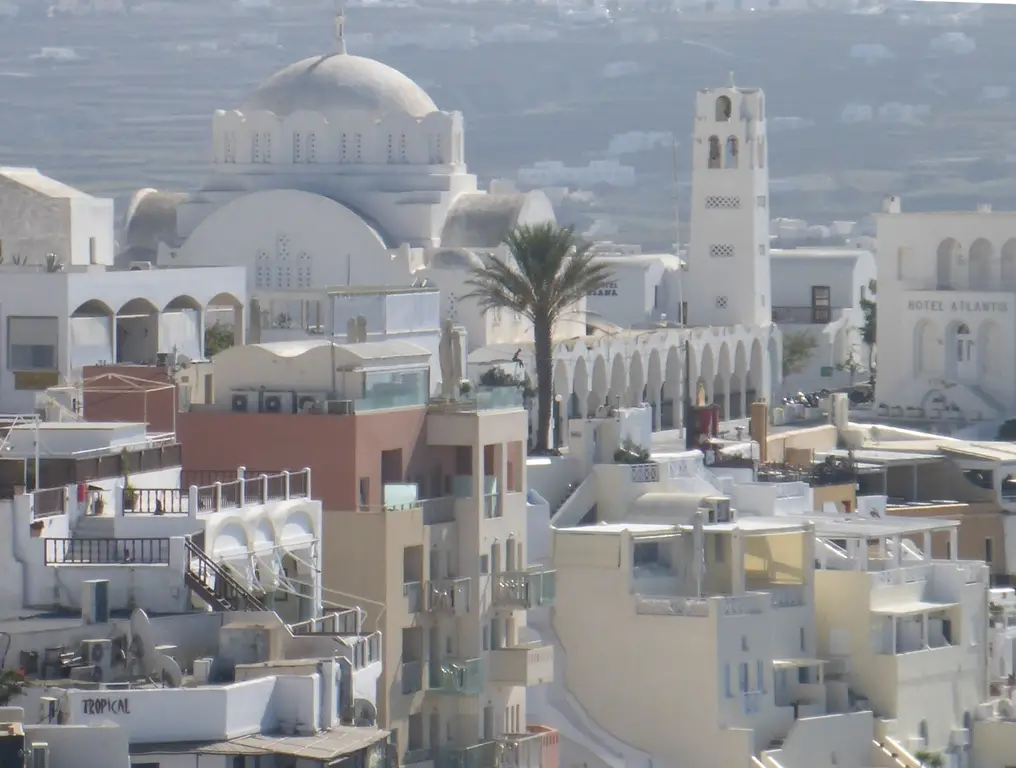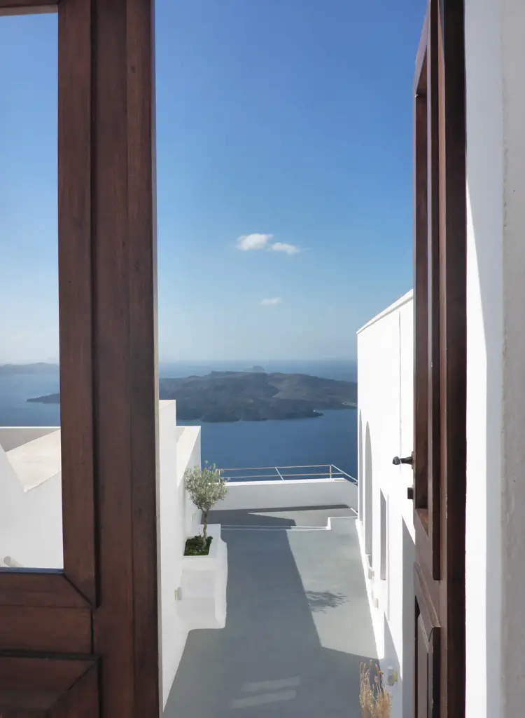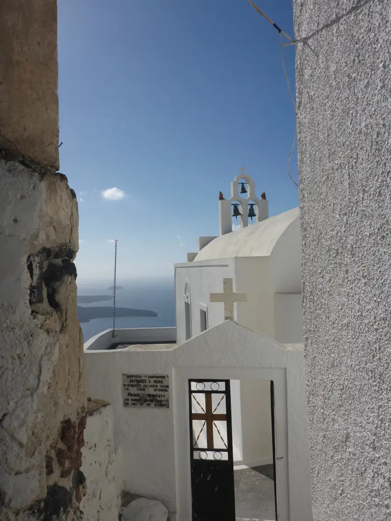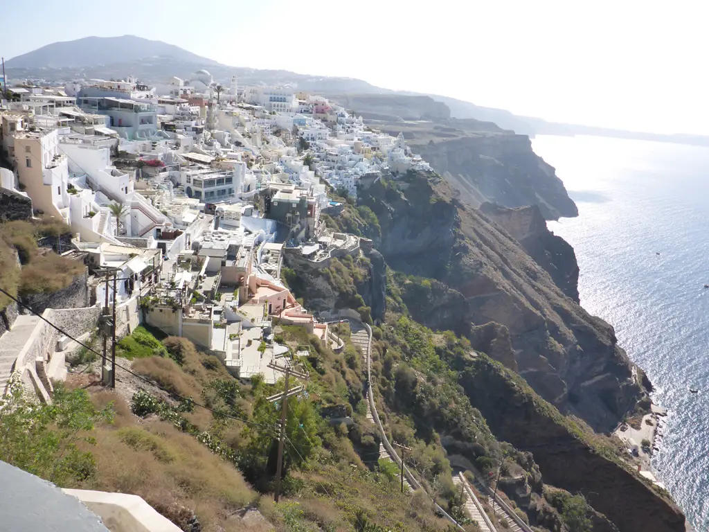 Leuchtende, weiße Häuser, steile Klippen und darüber kreisende Möwen prägen den Blick, wenn man von dem Ort Fira aus gen Nea Kameni, der kleinen Schwesterinsel von Santorin, sieht. Mit dem Schiff kann man nach Nea Kameni übersetzen und einen immer noch aktiven Vulkan besuchen – sowie in heißen Quellen baden.