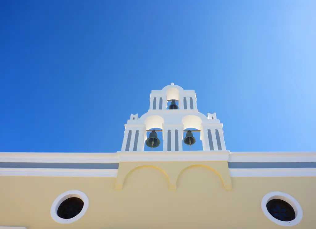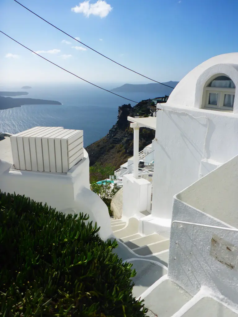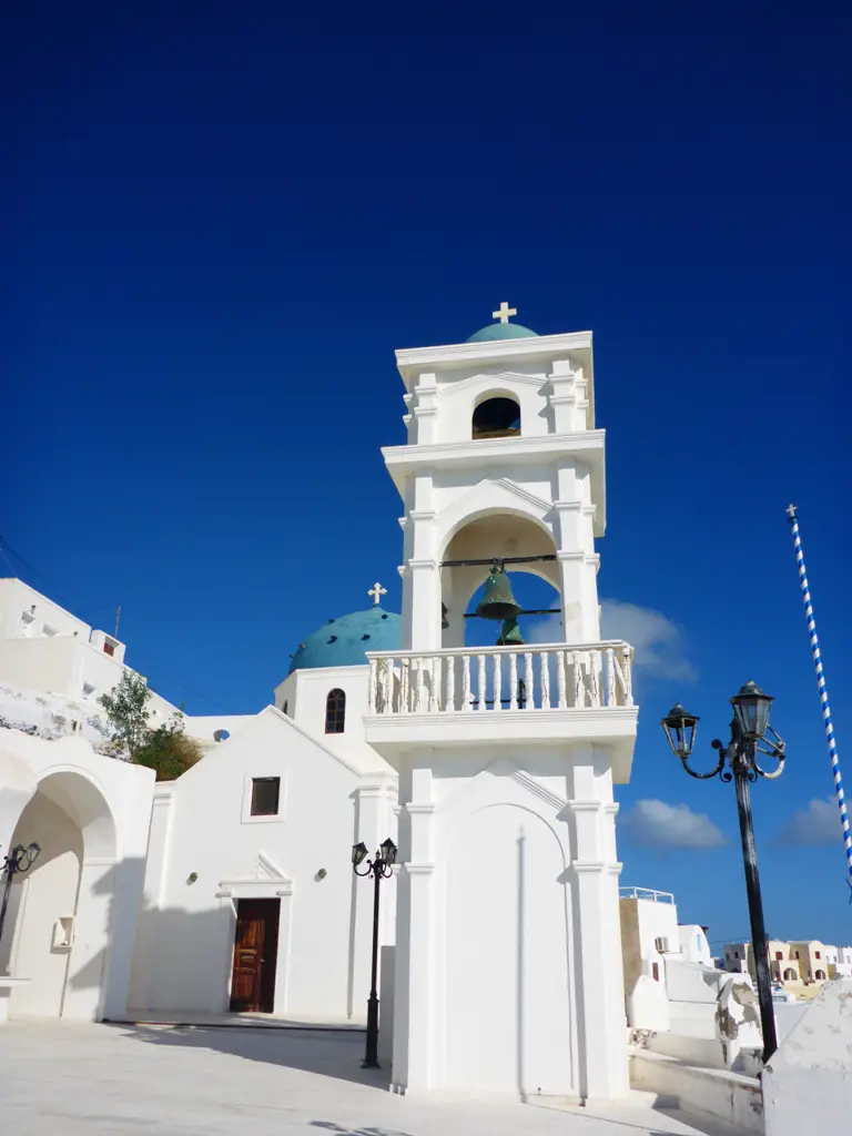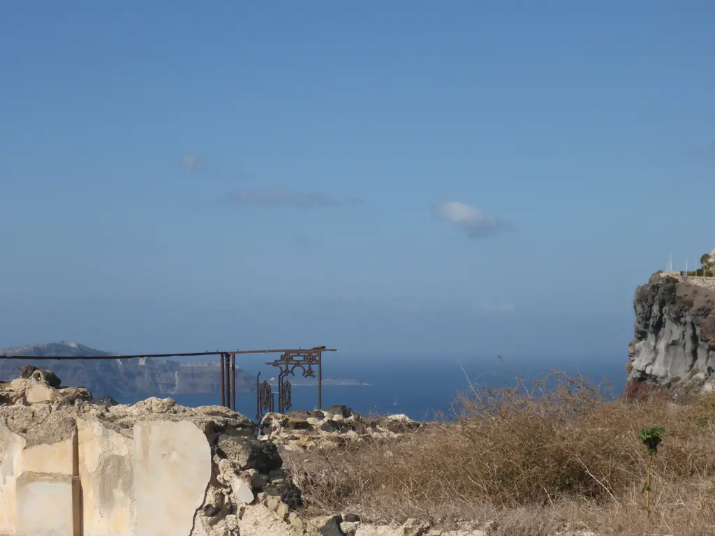 Leuchtende, weiße Häuser, steile Klippen und darüber kreisende Möwen prägen den Blick, wenn man von dem Ort Fira aus gen Nea Kameni, der kleinen Schwesterinsel von Santorin, sieht. Mit dem Schiff kann man nach Nea Kameni übersetzen und einen immer noch aktiven Vulkan besuchen – sowie in heißen Quellen baden.