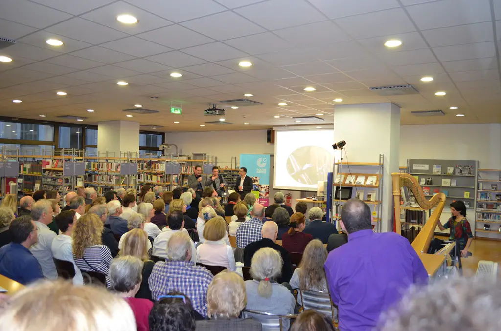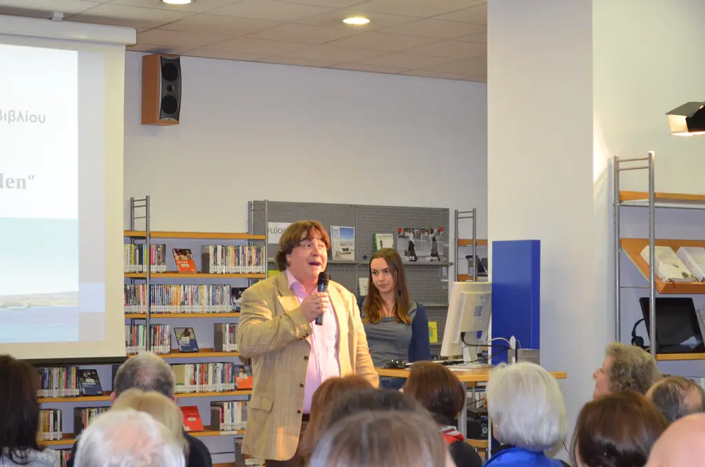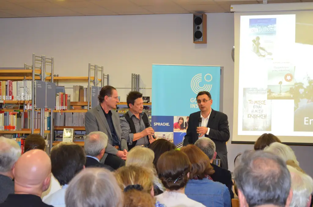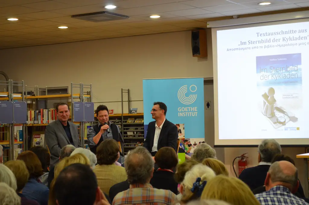Viel Andrang, Interesse, Lob, Gesprächsstoff und … Musik. Durchaus gelungen war die Präsentation des GZ-Buches von Emilios Solomou „Im Sternbild der Kykladen“ am vorigen Freitag im Athener Goethe-Institut. Vor mehr als 100 Gästen stellten GZ-Herausgeber Jan Hübel und Robert Stadler den Autor Solomou, aber auch die Serie von fünf Übersetzungen griechischer literarischer Werke vor, die der GZ-Verlag bis zum Herbst dieses Jahres publizieren wird.
