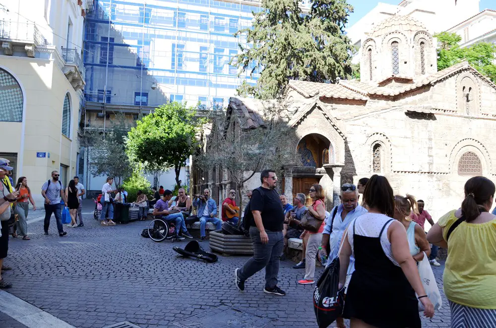Die Kirche im Hintergrund ist der Mutter Gottes geweiht. Und sie ist schon sehr, sehr alt: Gebaut wurde sie im 11. Jahrhundert. Sie steht heute mitten auf der Einkaufsstraße Ermou, die eigentlich keine Straße mehr ist, sondern eine mondäne Fußgängerzone. Dass dieses architektonische Kleinod der griechischen Hauptstadt nicht abgerissen wurde, wie Anfang der 30er Jahre des 19. Jahrhunderts geplant, soll übrigens König Otto zu verdanken sein.