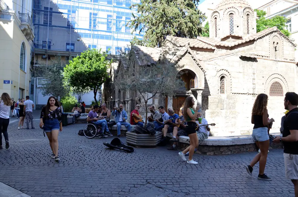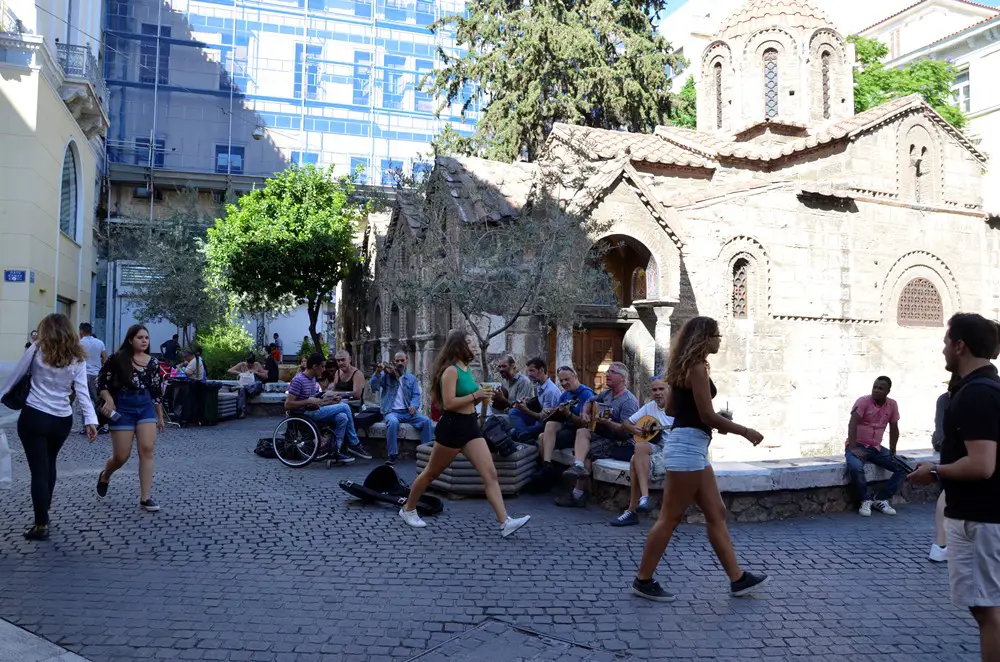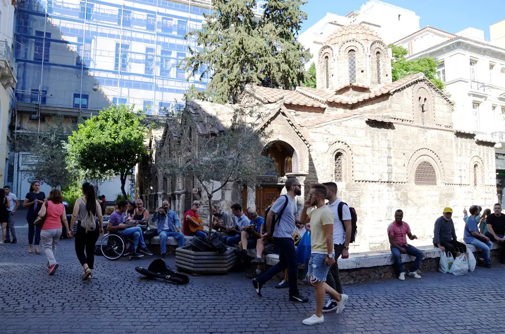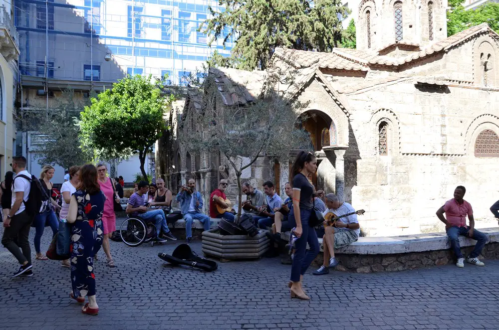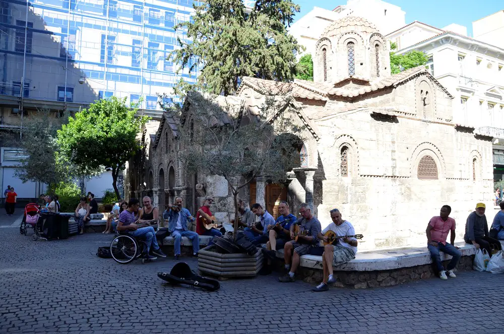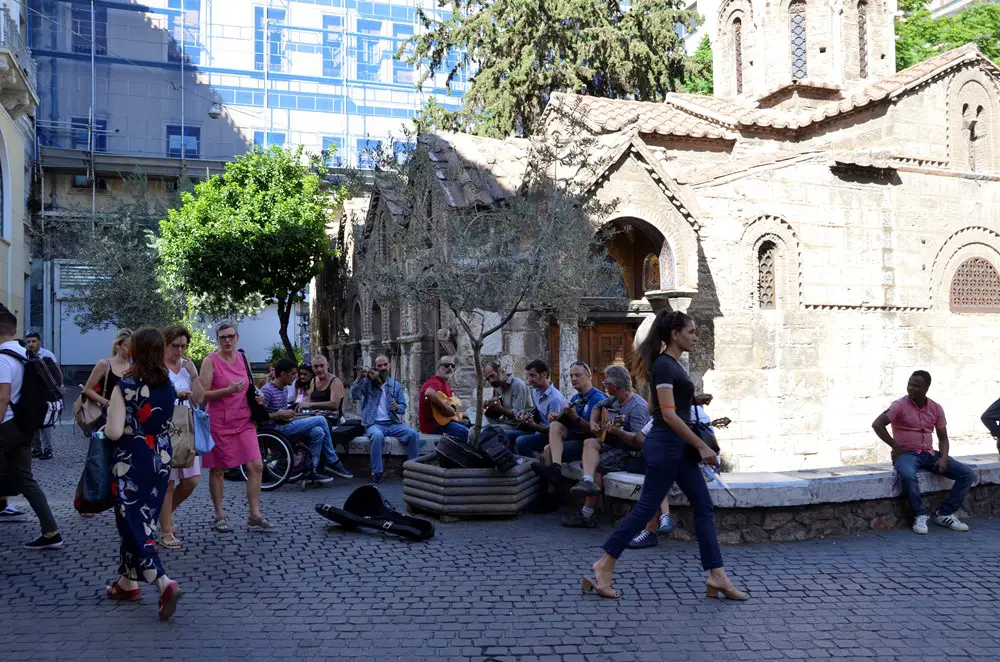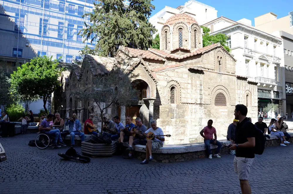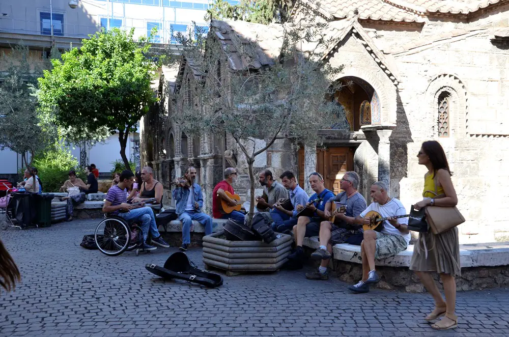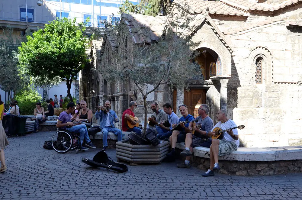 An der Kapnikarea-Kirche im Herzen Athens gibt es immer viel zu sehen – und oft auch viel zu hören (siehe unser Video). Heute spielt eine Rembetiko-Gruppe auf: ohne technische Verstärker, bitteschön!