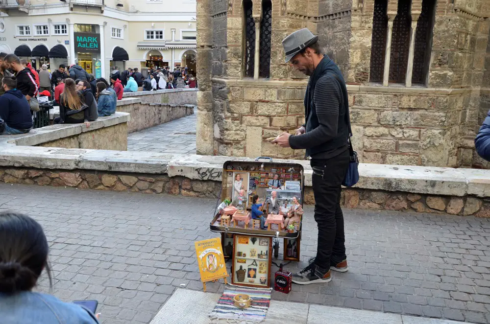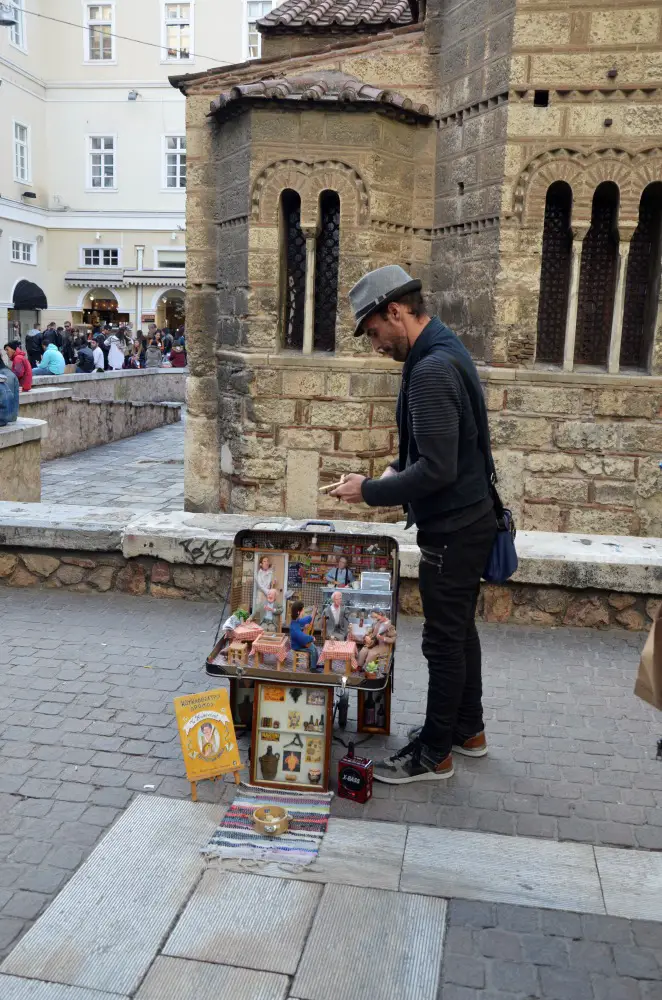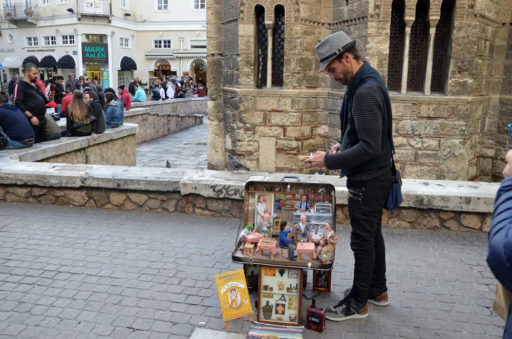 Bouzouki in der Taverne? Ja klar, schon oft erlebt. Aber hier handelt es sich um ein Puppenspiel. Standort ist vor der Kapnikarea-Kirche an der Athener Ermou Straße. Ein sehr anziehender Platz in der griechischen Hauptstadt. Auch den drei hölzernen Musiker im Köfferchen scheint dieses Plätzchen hier zu gefallen: Sie spielen fleißig vor interessiertem Publikum. Ob letztlich wohl genug Münzen zusammen kommen, damit sie sich am Abend auch ordentlich etwas in der Taverne bestellen können? Das bleibt abzuwarten: Die Zeiten für Straßenkünstler sind nicht eben rosig.