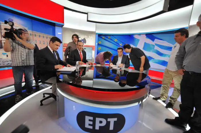 Bei ERT hat sich der Wind inzwischen gedreht. Nachdem der Sender im Juni 2013 vom damaligen Regierungschef Antonis Samaras (Nea Dimokratia) buchstäblich über Nacht geschlossen wurde, eröffnete die neue Regierung unter Alexis Tsipras (4. v. r.) den Sender nach seinem Wahlsieg am 25. Januar wieder. Damit wurde ein Wahlversprechen eingelöst, das Tsipras mit seinem Bündnis der Radikalen Linken (SYRIZA) gegeben hatte. Unsere Aufnahme entstand am 29. Juni als Tsipras ein Fernsehinterview bei ERT gab.