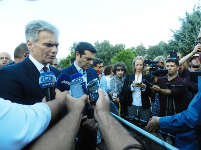Unser Foto (© Eurokinissi) entstand am Dienstag dieser Woche (6.10.) auf der Insel Lesbos während des gemeinsamen Besuches von Ministerpräsident Alexis Tsipras (r.) und dem österreichischen Bundeskanzler Werner Faymann. Die beiden Politiker hatten dort ein Erstaufnahmelager für Flüchtlinge besucht.