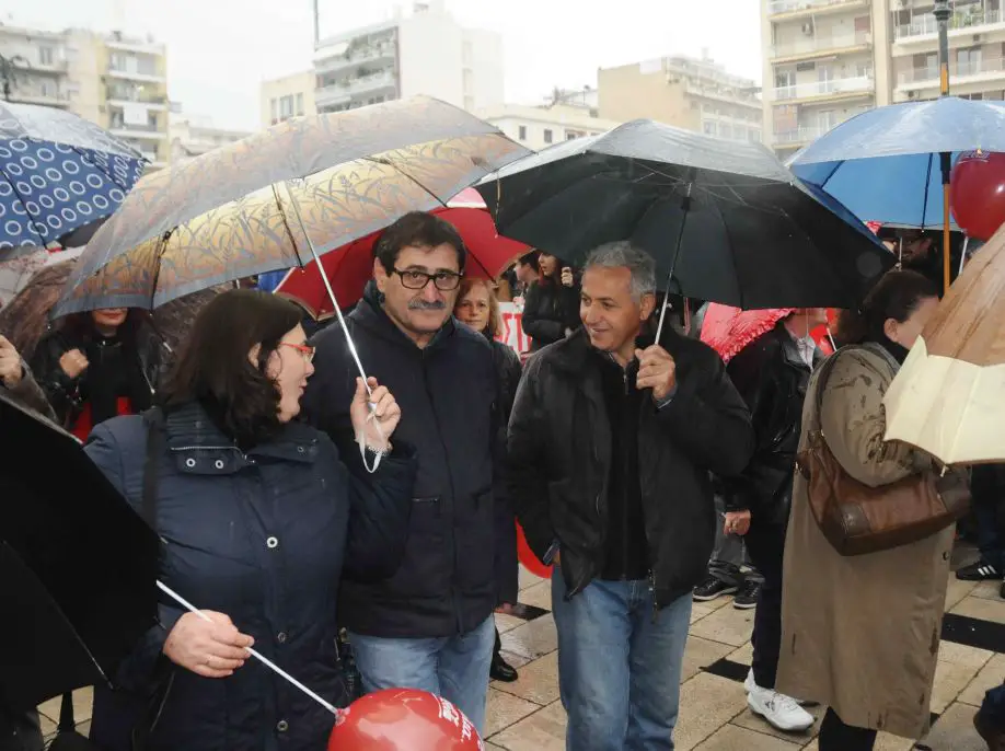 Unser Archivfoto (© Eurokinissi) entstand Ende November 2014. Es zeigt Bürgermeister Peletidis (2.v.l.) während einer Protestkundgebung in der Hafenstadt Patras, wo er der Chef im Rathaus ist.