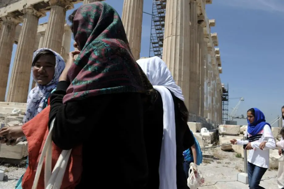 Unser Archivfoto (© Eurokinissi) zeigt Flüchtlinge, die am 9. Mai der Athener Akropolis einen Besuch abstatteten. Eingeladen dazu hatte der Minister für Tourismus und Sport Aristidis Baltas.
