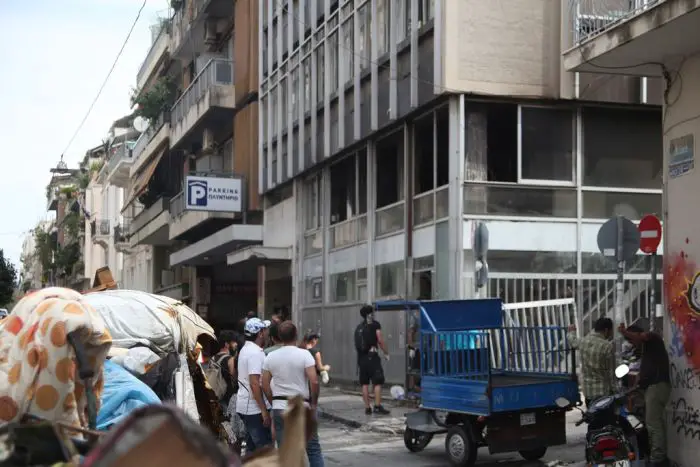 Unser Foto (© Eurokinissi) zeigt das Gebäude in der Athener Notara-Straße im Stadtteil Exarichia, wo sich am 24. August der Brandanschlag ereignete. Untergebracht waren hier Flüchtlinge.