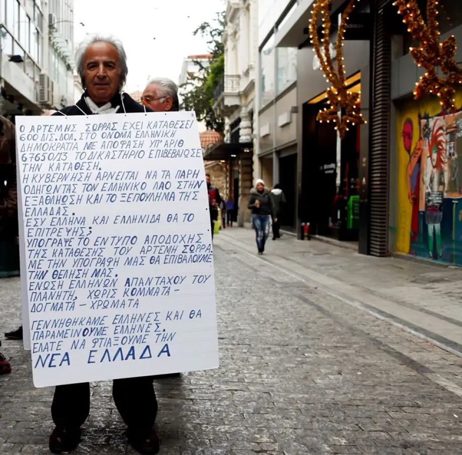 Unser Archiv-Foto (© Eurokinissi) entstand bereits am 16. Dezember 2013. Geworben wird auf dem Transparent für Artemis Sorras und dessen Initiative. Der Text lautet etwa wie folgt: Sorras hat 600 Mio. Euro zu Gunsten von Hellas deponiert – die Regierung weigert sich jedoch, dieses Geld zu nutzen – und will vielmehr das Land verkaufen. Mit seiner Unterschrift kann jeder einfache Bürger dazu beitragen, dieses Unrecht zu verhindern. „Kommt, um das neue Griechenland aufzubauen!“, so der letzte Satz auf dem Schild.
