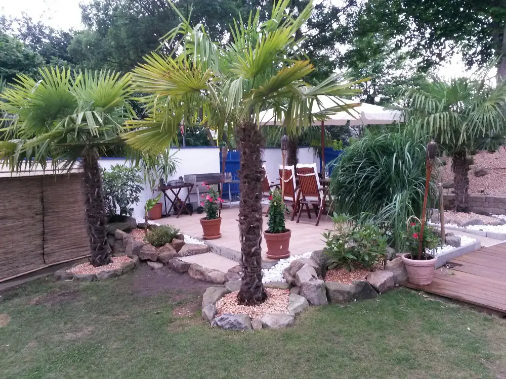 Von außen zieren Palmen das Haus, und auch im Garten findet man die tropische Pflanze wieder. „Wir haben das Haus mediterran umgestaltet, und wenn das Wetter mitspielt, haben wir das Gefühl, in Griechenland im Urlaub zu sein“, sagt Andreas Türpe.
