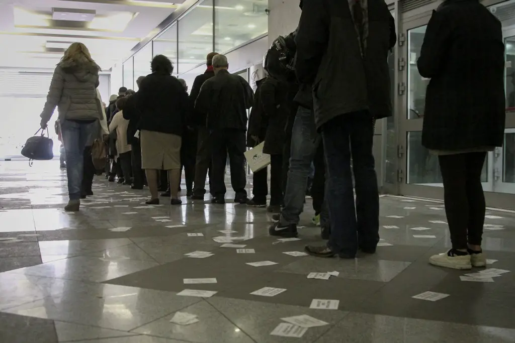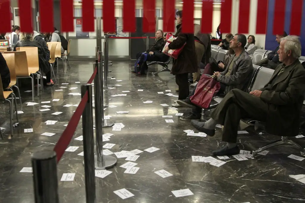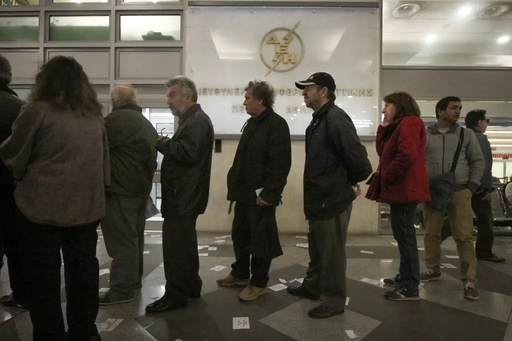 Unsere Fotos (© Eurokinissi) entstanden am 30.11.2017 in den zentralen Büros des Energieerzeugers DEI in Athen. Abgebildet sind Bürger, die ihre Stromrechnungen bezahlen wollen. Die Flugblätter am Boden hatten kurz zuvor Mitglieder der anarchistischen Organisation „Rouvikonas“ (Rubikon) verbreitet.