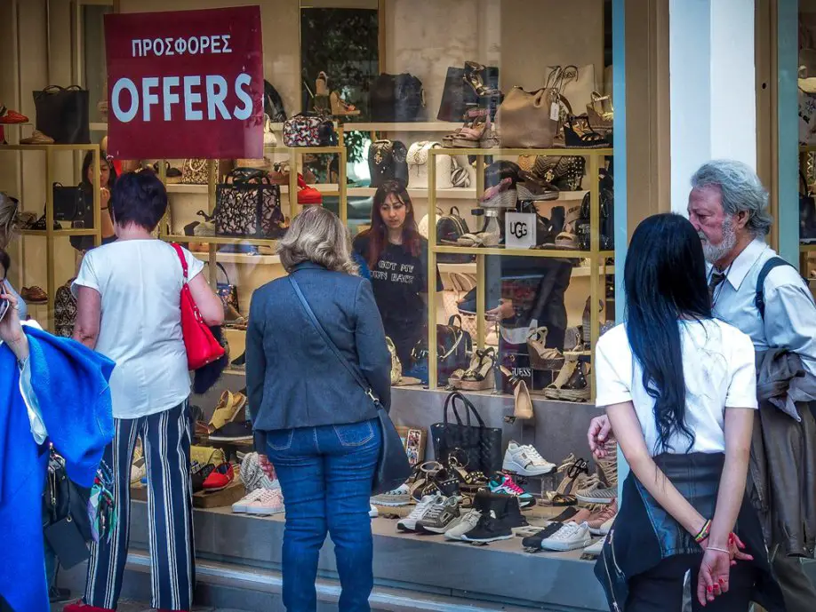 Zwischen dem 1. und dem 15. November findet in Griechenland ein herbstlicher Schlussverkauf statt. Wie die Athener Handelskammer feststellt, müssen sowohl der alte Preis als auch der neue mit Rabatt bei den angebotenen Produkten ausgewiesen werden.