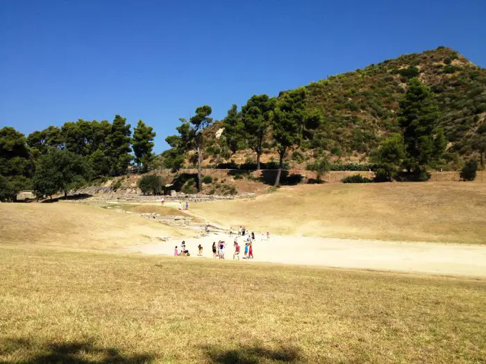 Um diese herum konnten die Zuschauer entweder stehen oder aber auf Erdbanketten bzw. steinernen Sitzreihen Platz nehmen. Stadien besaßen damals also, anders als heute, eine ausgeprägte Längsorientierung, die den dort veranstalteten Laufwettbewerben geschuldet war. Daneben konnten freilich auch andere Sportarten in ihnen ausgetragen werden. Die Bezeichnung als „Stadien“ verdanken die entsprechender Sportstätten der Länge ihrer Laufbahnen, die nach antiker Regel genau einem „Stadion“ entsprach. Mit ihren Längenmaßen orientierten sich die alten Griechen grundsätzlich zwar weitgehend an Teilen des menschlichen Körpers: Besonders die Elle (gr. „péchys“) und der Fuß (gr. „pus“) galten ihnen dabei als zentrale Bezugspunkte, in denen sie Distanzen angaben. Für größere Entfernungen allerdings waren beide Einheiten gleichermaßen ungeeignet, und so wurden solche eben in „Stadien“ bemessen. Die Bindung an das menschliche Maß blieb dabei aber bestehen, betrug ein „Stadion“ doch stets 600 „Fuß“. Und dies war eben auch die verbindliche Länge für die Laufbahnen der betreffenden Sportstätten, die wohl schon im 6. Jahrhundert v. Chr. nach der Maßeinheit benannt wurden. Weichen die antiken Stadien in ihrer Länge dennoch immer etwas voneinander ab – in Delphi etwa beträgt sie ungefähr 177 Meter, in Olympia dagegen 192 Meter – so liegt das daran, dass der „Fuß“ grundsätzlich zwar überall um die 30 Zentimeter lang war, seine exakte Abmessung regional aber durchaus geringfügigen Abweichungen unterlag.