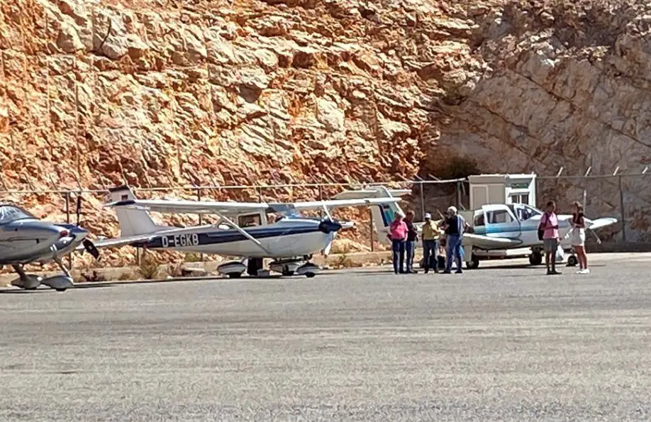 Da hatte man kurz vor der Landung in der frühen Mittagszeit noch die drei winderprobten Flaggen Europas, Griechenlands und der Insel an den niedrigen Fahnenmasten gegen fabrikneue Exemplare ausgetauscht und mit dem einzigen Inseltaxi Wasserflaschen und griechische Häppchen zur Begrüßung der insgesamt 24 Rally-Teilnehmer heranbringen lassen. Zimmer für die Deutschen standen im Hotel Megisti an der Hafeneinfahrt es einzigen Inselortes bereit. Problemlos setzen die zehn Maschinen auf der nur 798 Meter langen Landebahn auf und rollten aufs kleine Vorfeld.