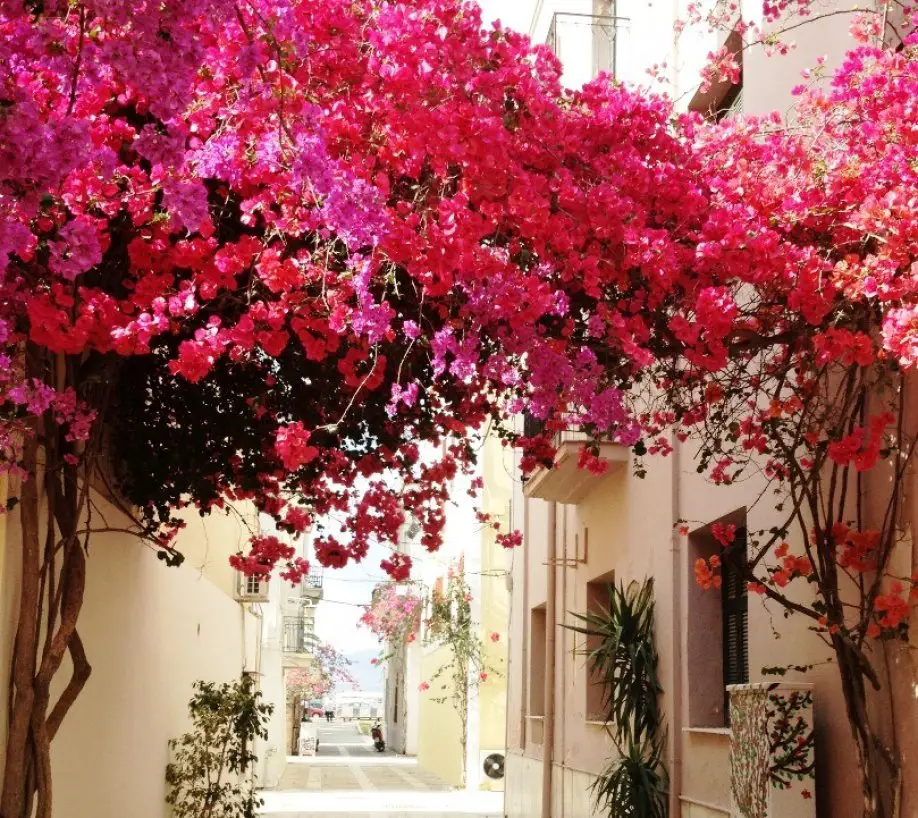 Nicht umsonst zählt die Pflanze zur Familie der Wunderblumengewächse. Wahrlich wunderbar ist ihr Anblick und in ihrer vollen Pracht quasi ein naturgegebenes Zeichen, das in all ihrer unschuldigen Aufdringlichkeit zu verkünden scheint: „Du befindest dich im Süden!“ Ursprünglich stammt die Drillingsblume mit ihrem in bunten Hochblättern stehenden Blütentrio aus Südamerika. Ihren Titel verdankt sie dem französischen Seefahrer und Entdecker Louis Antoine de Bougainville. Als erster Franzose umsegelt Bougainville im Zeitraum von 1766 bis 1769 die Welt. Bei einem Zwischenaufenthalt in Brasilien entdeckt einer seiner Reisebegleiter, der Botaniker Philibert Commerçon, eine äußerst blütenreiche Pflanze – und benennt die Gattung nach seinem Kapitän. Ganze Hausfronten – wie man das ja aus südlichen Mittelmeergebieten kennt – können wegen ungenügender Frostresistenz in Deutschland, Österreich und der Schweiz leider nicht zuwachsen. Auch auf einer gegen den Süden gerichteten Wand mit vor Regen schützendem Dachüberstand wird’s wohl nicht funktionieren. Obwohl sie recht kältetolerant ist – mitteleuropäische Winter verzeiht die Bougainvillea nicht. Was sie auch nicht verträgt, ist Staunässe im Topf. Im Grunde braucht die Pflanze also nur wenig Wasser. Sind die Wurzeln zu nass, fallen die Blätter. Zu trocken hingegen klingt die wissenschaftliche Beschreibung der Südblume, deren Blüten laut Lexikon radiärsymmetrisch und ihre Hüllblätter trichterförmig verwachsen sind. Weder der gestielte und spindelförmige Fruchtknoten noch der leicht gebogene Griffel bringen den Glanz der Bougainvillea auf den Punkt. Am besten sprechen da ohnehin nicht Worte, sondern die Bilder für sich – so wie dieser Schnappschuss in den Gassen von Nafplio.