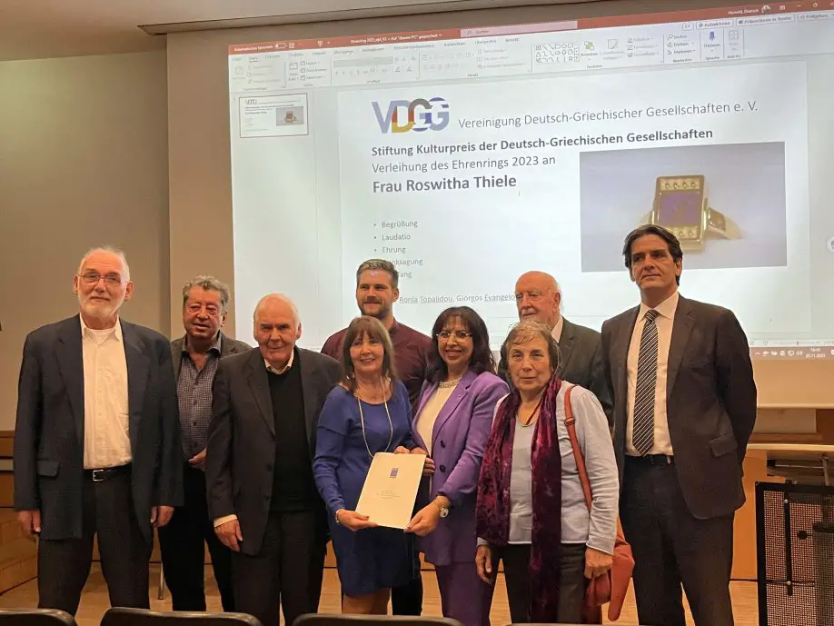 Der Ehrenring der Vereinigung der Deutsch-Griechischen-Gesellschaften (VDGG) wurde in diesem Jahr an Roswitha Thiele verliehen. Die Preisträgerin engagiert sich seit über 20 Jahren für die Förderung der SOS-Kinderdörfer in Griechenland.