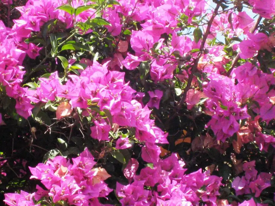 Doch ihr deutscher Name „Kahle Drillingsblume“ ist kaum bekannt. „Drillingsblume“ – passend und korrekt benannt wegen ihrer eigentlichen Blüten, die aus drei Röhrenblüten bestehen: klein, weißlich, ohne Duft und ohne auffälliges Aussehen. Aber solch eine prächtige Pflanze braucht doch einen respektablen Namen! Die Anziehungskraft strahlen ja auch nicht diese Blüten aus. Es sind die farbigen Hochblätter, die für die kleinen fliegenden Gäste, wie auch für uns, der magnethafte Anziehungspunkt schlechthin sind: Farbe, Farbe und noch mehr Farbe…Von den eigentlichen grünen Blättern ist daher nicht mehr viel zu sehen, so dicht gedrängt beieinander stehen die Hochblätter. Rot, rosa oder pink, sogar in weiß, gelblich und orange gibt es sie. Leicht wie Seidenpapier fühlen sie sich an, noch mehr denn je, wenn sie trocken sind. Sie dienen dann als sogenanntes Flugorgan, das zusammen mit dem Samen vom Sommerwind davongetragen werden kann. Da dieser Same allerdings nur in tropischen bis subtropischen Gebieten voll ausgeprägt ist, empfiehlt es sich Stecklinge zu machen, will man nicht vor lauter Schwärmen die Gärtnerische Seite vergessen. Mit ihren Dornen klettern die Drillingsblumen aus dem Süden Amerikas nun an Mauern hoch und zieren die Häuser und Innenhöfe rund um das Mittelmeer. Nach Süden ausgerichtet müssen sie sein. Natürlich, ihre Heimat ist schließlich Brasilien.