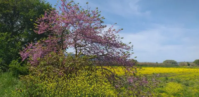 Glücklicherweise wartet der Gewöhnliche Judasbaum aus der Familie der Johannisbrotgewächse mit anderen Namen auf. Der Cercis siliquastrum wird auch als Salatbaum und in seiner schönsten Version als Liebesbaum bezeichnet. Der Grund für letzteren Namen ist auf die Form seiner purpurroten Blütenblätter zurückzuführen, die an Herzchen erinnern. Weltweit gibt es zehn verschiedene zur Gattung der Judasbäume gehörende Arten. Hier am Ionischen Meer fängt der Liebesbaum bereits im April zu blühen an. Hiesiges Klima und die kalkreichen, steinigen Böden mit ihrem mäßigen Nährstoffgehalt scheinen für sein Gedeihen äußerst bekömmlich zu sein, denn sei es in der Ebene – zu Füßen der Berge –, in den Wiesen, auf Feldern und Berghängen, überall erleuchten die Liebesbäume in ihrer vollen Blütenpracht. Wie riesige purpurfarbene Blumensträuße sehen sie in der um diese Jahreszeit strotzend grünen Landschaft aus, die Farbtupfer sind ein absoluter Hingucker! Zu meiner Freude habe ich gleich hinterm Haus einen kleinen, blühenden Judasbaum entdeckt. Ich hielt ihn bisher für ein Gehölz unter anderen, bis er Blüten zu treiben begann. Bis zu 30 Zentimeter wächst der Judasbaum pro Jahr, und so wird in einigen Jahren hinterm Haus ein prächtiger Liebesbaum im Feld stehen. Die Blüten sind übrigens essbar und werden im Orient zur Verzierung von Speisen und Salaten verwendet. Bei ihren prachtvollen Kronen und den Abertausenden von Blüten erkundige ich mich bei meiner Nachbarin Stassoula, welche Früchte die Blüten wohl hervorbringen werden? „Το δέντρο του Ιούδα?“ – „Der macht keine Früchte“, sagt sie zu meiner Verwunderung, „keine Aprikosen, keine Maulbeeren. Der macht Blüten und sieht schön aus, sonst macht der gar nichts!“