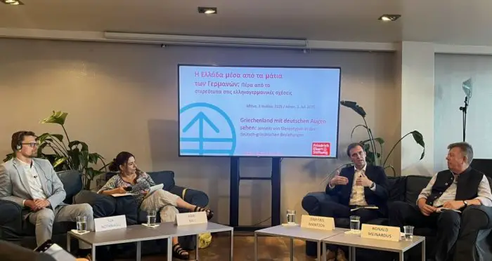 Mit vor Ort bei der Präsentation der Studie waren der Botschafter der Bundesrepublik Deutschland in Griechenland, Andreas Kindl, sowie die Büroleiterin der Friedrich-Ebert-Stiftung in Athen, Regine Schubert. Nachdem die Ergebnisse vorgestellt wurden, fand anschließend eine Diskussion zwischen Ronald Meinardus, Dimitris Mantzos sowie Ilja Nothnagel unter der Moderatorin der griechischen Journalistin Kaki Bali statt. Die Debattierenden waren sich einig, dass es von besonderer Bedeutung ist, wie die Politik mit diesen Umfrageergebnissen umgehen würde und was Deutschland und Griechenland in ihrer bilateralen Beziehung voneinander lernen könnten. Denn der Tourismus in Griechenland würde auch Risiken bergen, weshalb es von besonderer Wichtigkeit sei, das Wirtschaftswachstum anderweitig aufrecht zu erhalten. Da Deutschland nicht nur wirtschaftlich, sondern auch politisch ein wichtiger Partner sei, gelte es, Herausforderungen gemeinsam zu lösen und offene Gespräche zu führen. Nicht zuletzt sind Deutschland und Griechenland Mitglieder der NATO und der EU, weshalb sie als strategische Partner interagieren müssen. Ilja Nothnagel brachte es mit der Feststellung auf den Punkt und betont, dass die Höhen und Tiefen der bilateralen Beziehung zwischen Deutschland und Griechenland von Stärke zeugen. Der Blick in die Zukunft bleibt demnach positiv, auch wenn noch einige Fragen offenstehen. Einen ausführlichen Bericht über die Studie, genauere Zahlen und Informationen sowie eine Einordnung in den zeitgeschichtlichen Kontext erscheint in einem zweiteiligen Bericht von Ronald Meinardus in der neuen Ausgaben der Griechenland Zeitung von dieser Woche (GZ 979 v. 9.7.2025).