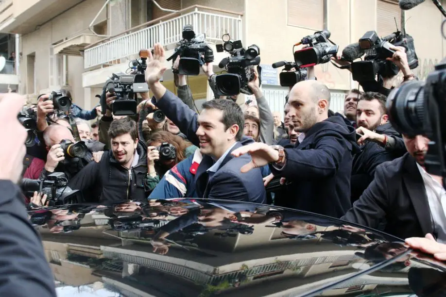 Unser Foto (© Eurokinissi) zeigt den jetzigen Ministerpräsidenten Alexis Tsipras (SYRIZA) am 25. Januar, dem Tag seines Wahlsieges, in der Nähe seiner Wohnung im Athener Stadtteil Kypseli.