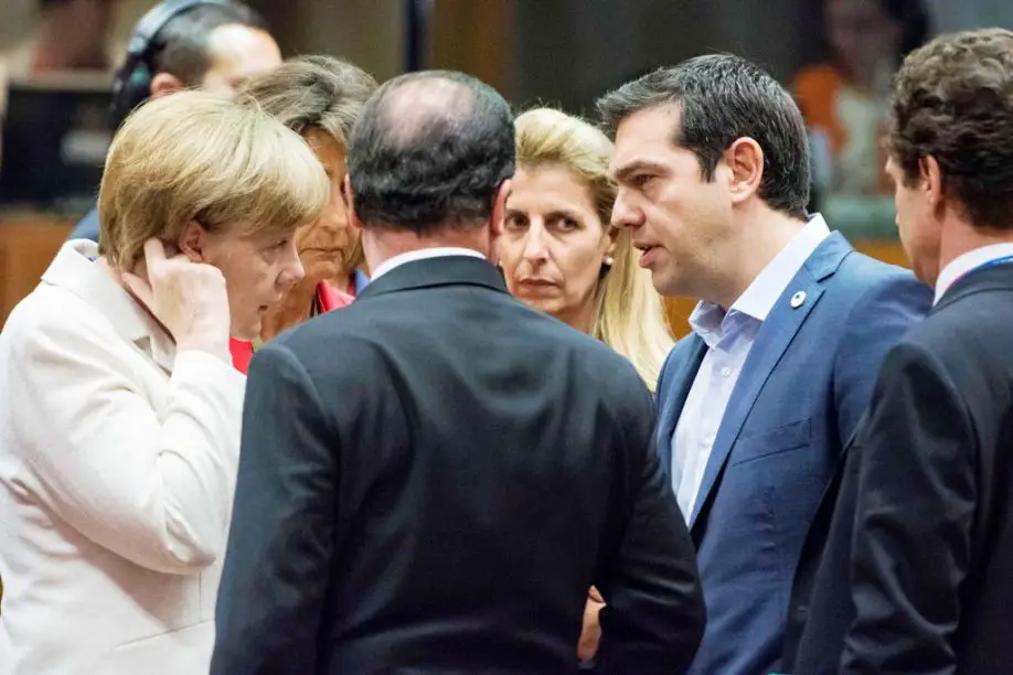 Unser Foto (© Eurokinissi / Europäische Union) entstand beim EU-Gipfel in Brüssel am 12. Juli. Abgebildet sind die deutsche Bundeskanzlerin Angela Merkel und Ministerpräsident Alexis Tsipras. Im Vordergrund (Rückenbild) der französische Präsident Francois Hollande.
