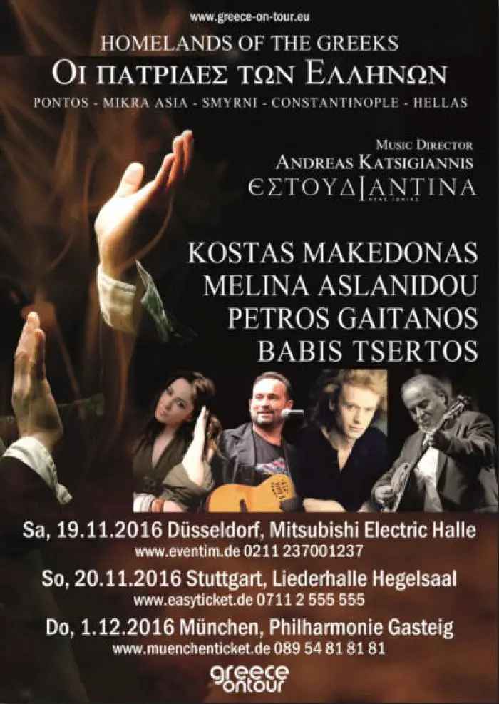Es geht ihnen dabei um den Eindruck, dass die Griechen zwar in allen Teilen der Welt verstreut leben, sie aber trotzdem eine Zugehörigkeit zu einem Volk verbindet. Für die Künstler ist dabei die „Kleinasiatische Katastrophe“, mit der Vertreibung der Griechen aus dem Osmanischen Reich im 20. Jahrhundert, das entscheidende Ereignis. In ihren Augen brach dabei „die seit der Antike bestehende griechische Gemeinschaft auseinander“, so die Konzert-Ankündigung. Also besingen sie ihre gemeinsame Herkunft und das Griechentum.