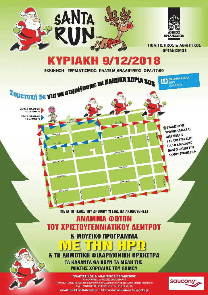 Kinder, Jugendliche, Erwachsene oder Senioren— beim „Santa Run“ ist jeder willkommen, der eine Weihnachtsmütze oder – Anzug trägt. Je nach Fittness-Level und Alter kann man zwischen einer 1 Kilometer- oder 5 Kilometer-Strecke wählen. Die Teilnahmegebühr beträgt 5 Euro und der gesamte Erlös der Veranstaltung wird an das SOS-Kinderdorf gespendet. Anmeldungen sind an allen Werktagen von 9 bis 14 Uhr bei der Kultur- und Sportorganisation PAODIB vor Ort oder online unter www.vrilissia-arts-sports.gr möglich.