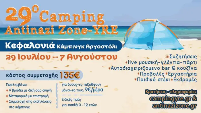Das sogenannte Antinazi-Zone-Camp, mitgetragen von der Organisation Youth against Racism in Europe (YRE), findet in diesem Jahr zwischen dem 29. Juli und dem 7. August auf der Insel Kefalonia statt, und zwar konkret auf dem „Camping Argostoli“.