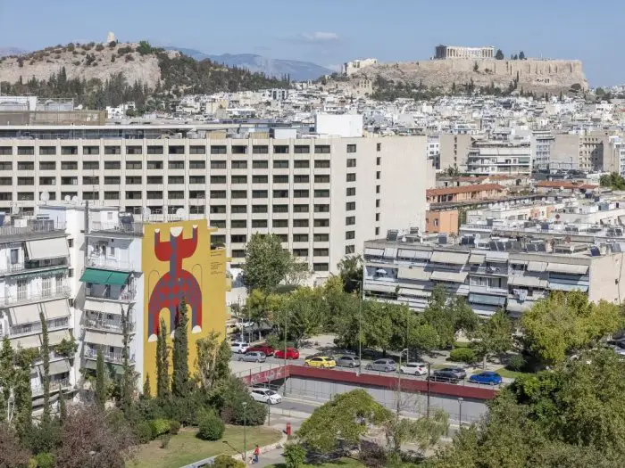 Im Viertel Neos Kosmos (Od. Lagoumitzi 42) ist zu einer Reihe von Urban-Art-Projekten in Athen eine neue Fassadenmalerei hinzugekommen. Sie stammt von der Architektin und Malerin Eleni Psyllaki, trägt den Titel „Eine weibliche Figur in rotem und violettem Kostüm“ und wurde, wie bereits andere in der Vergangenheit auch, durch die Onassis-Stiftung unterstützt.