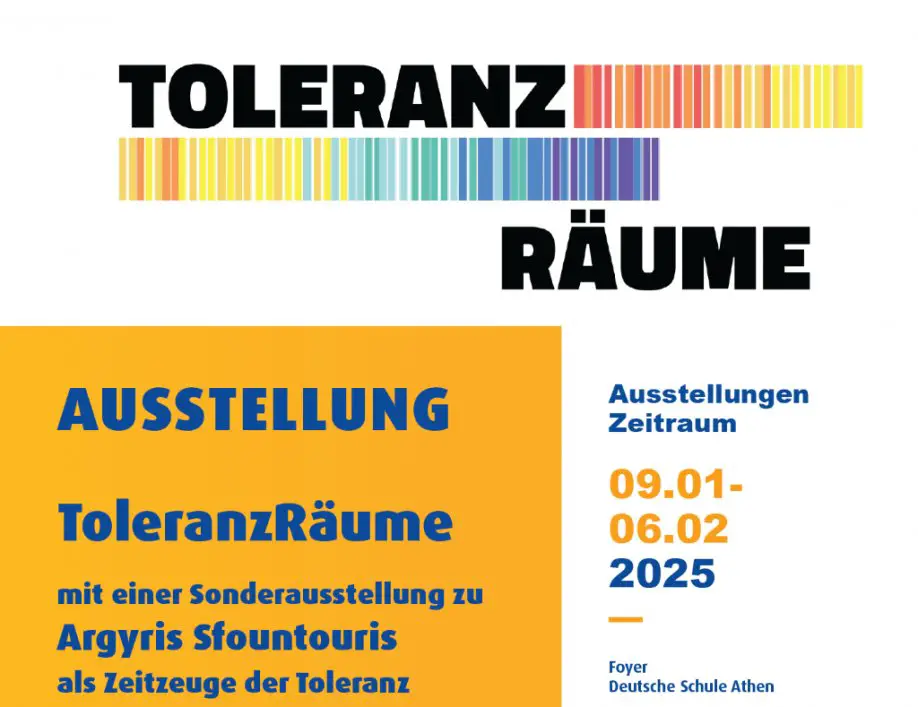 In der Deutschen Schule Athen wird noch bis zum 6. Februar die Ausstellung „ToleranzRäume“ sowie die Sonderausstellung zu Argyris Sfountouris als „Zeitzeuge der Toleranz“ gezeigt. „Gesellschaft, Schule, Familie können nur funktionieren, wenn sich ihre Mitglieder mit Respekt und Offenheit begegnen“, heißt es dazu in einer Mitteilung der DSA.