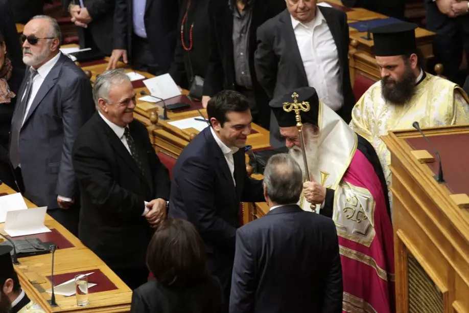 Die christlich-orthodoxe Zeremonie führte wie traditionell üblich der Erzbischof von Athen und ganz Griechenland durch. Einer der 300 schwur anschließend auf den Koran. In den Reihen der Regierungspartei SYRIZA sind drei Muslime vertreten – die anderen beiden haben einen politischen Eid abgelegt. Dies taten auch zahlreiche weitere Parlamentarier – die Mehrheit des Bündnisses der Radikalen Linken (SYRIZA), der kommunistischen KKE und der liberalen Partei „To Potami“. Vereidigt wurden sie „auf Ehre und Gewissen“.