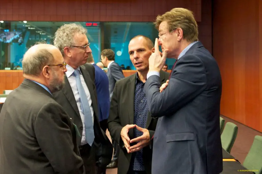 Unser Foto (Eurokinissi) zeigt Varoufakis (2. v. r.) am Montagabend im Gespräch mit Kollegen während des Treffens der Eurogruppe in Brüssel.