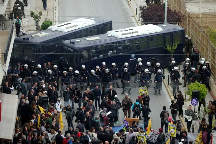 Im Rahmen des Prozesses ist es am Montag im Umfeld der Haftanstalt von Korydallos zu einem blutigen Zwischenfall gekommen. Zeugen der Anklage, die vor Gericht geladen worden waren, wurden brutal zusammengeschlagen. Außerdem kam es zu mehreren Kundgebungen vor allem von Antifaschisten. Anwohner des Gefängniskomplexes protestierten ebenfalls wegen befürchteter Ausschreitungen zwischen Faschisten und linken Gruppierungen. 11 Schulen und kommunale Behörden wurden deshalb geschlossen.