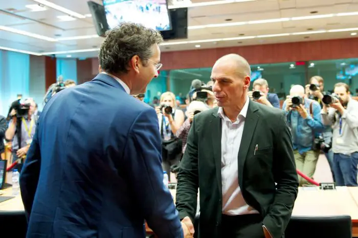 Unser Foto (© Eurokinissi/EU) zeigt Dijsselbloem am Rande der Sitzung der Eurogruppe am Montag im Gespräch mit Varoufakis (r.). Letzterer trägt sein Hemd ausnahmsweise in der Hose.