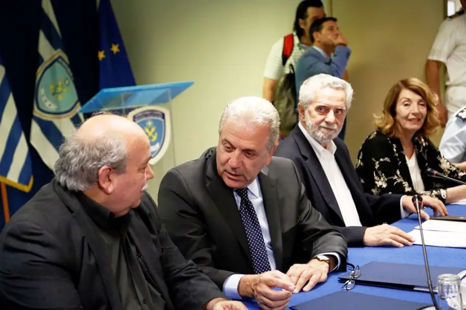 Unser Foto (© Eurokinissi) zeigt EU-Kommissar Avramopoulos am Dienstag während eines Treffens mit mehreren griechischen Ministern im Schifffahrtsministerium in Piräus, etwa 10 km südwestlich vom Athener Zentrum.