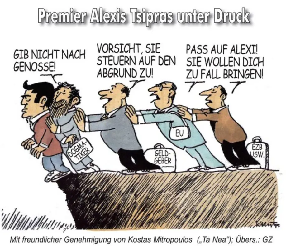 Die Karikatur zu diesem Beitrag wurde uns freundlicherweise von Kostas Mitropoulos zur Verfügung gestellt, einer der bekanntesten Karikaturisten Griechenlands. Mitropoulos wurde 1925 in Athen geboren und arbeitet seit Jahrzehnten für die in Athen erscheinende Tageszeitung „Ta Nea“ sowie für „To Vima“. Er wurde mit zahlreichen Preisen geehrt, u.a. von der Athener Akademie und vom griechischen Staatspräsidenten. Weitere Preise erhielt er bei internationalen Karikaturausstellungen. Er illustrierte auch das 2009 in unserem Verlag erschienene Buch „Ärmellos in Griechenland“ (gemeinsam mit Romiosini).